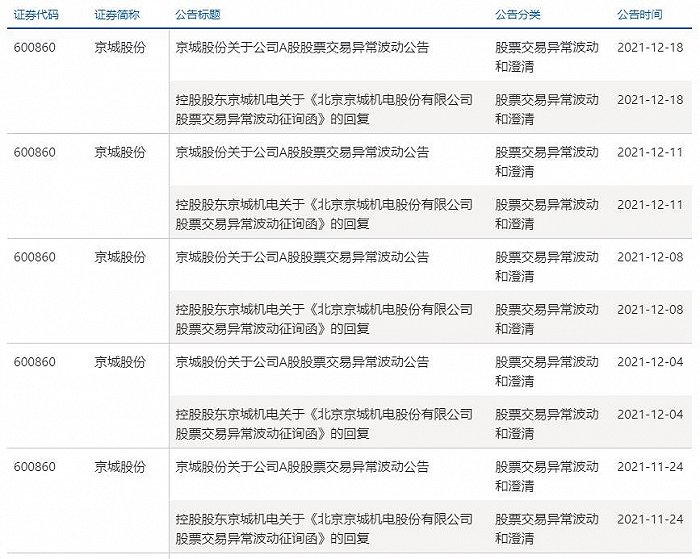 在股价上涨期间,京城股份一个月内先后5次发布了股价异动公告以及向控股股东征询函的回复情况。其中12月17日晚间发布的股价异动公告显示:“经公司自查,公司目前生产经营活动正常,内部生产经营秩序正常,公司主营业务未发生重大变化,不存在应披露而未披露的重大事项。”
