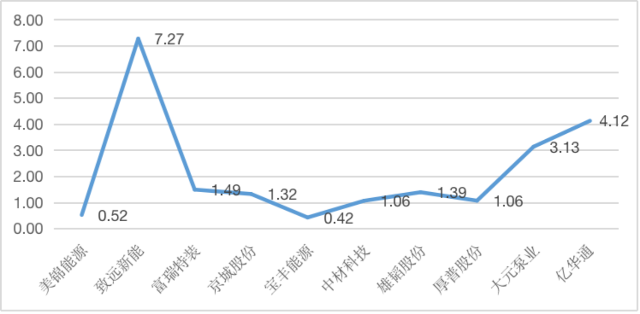 从“氢能源”赛道上看,首先,京城股份的流动比例仅为1.32(见图6),位于赛道末端,与致远新能、大元泵业和亿华通有较大差距。其次,企业营运能力良好(见图7),总资产周转率达到72.41%,仅次于大元泵业87.14%。第三,盈利能力和发展能力较弱,净资产收益率和总资产周转率分别为-3.38%和-8.03%。