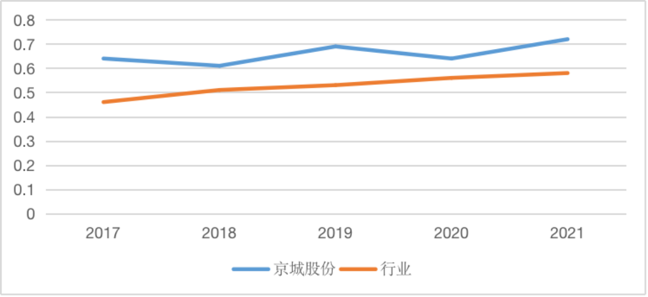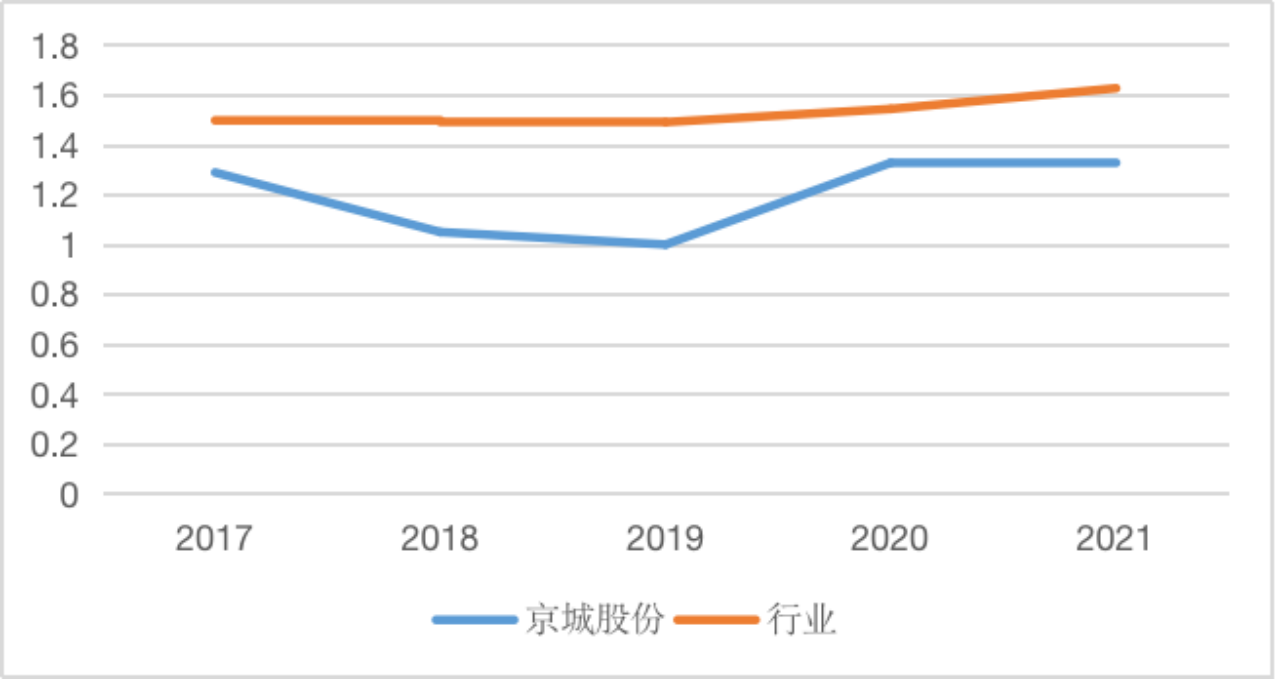 图5 2017年~2021年京城股份和所在行业的总资产周转率变动情况