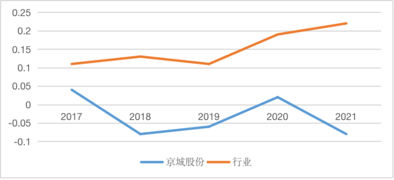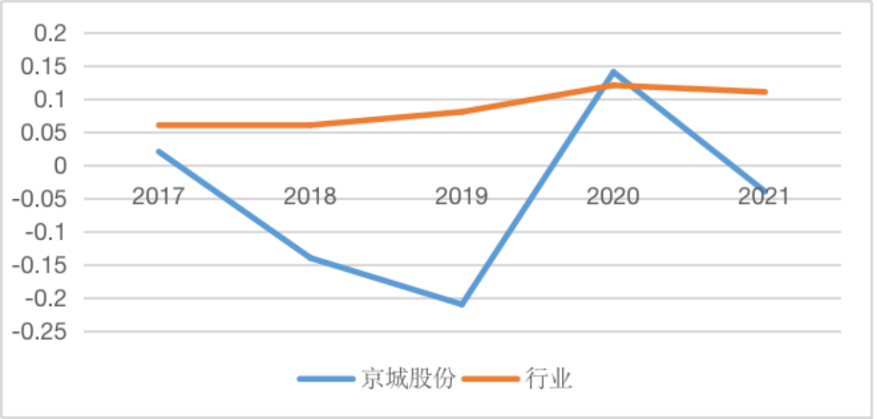 图4 2017年~2021年京城股份和所在行业的总资产增长率变动情况