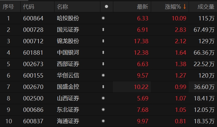 10月26日,券商股表现活跃,截至13时46分,哈投股份涨停,国元证券、锦龙股份涨超2%。