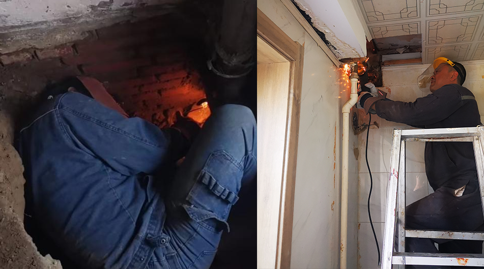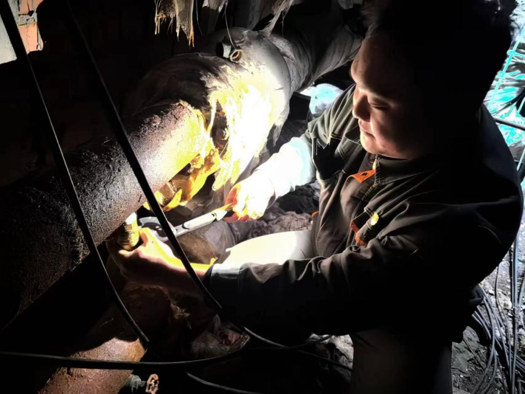 10月2日一早,北极邨站的工作人员王广利正在对一处发现的暖气管道漏点进行焊接维修。