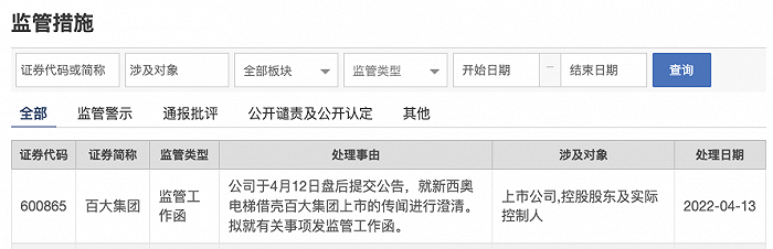 上交所就百大集团公告澄清新西奥电梯借壳公司上市传闻事项发监管工作函