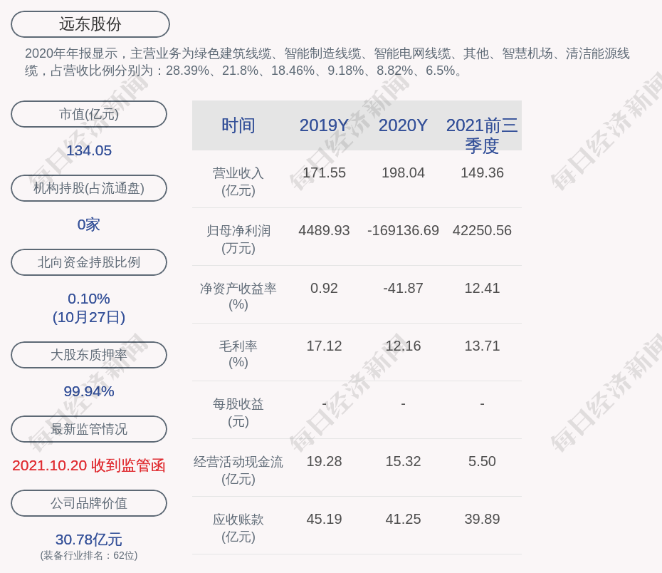 2020年年报显示,远东股份的主营业务为绿色建筑线缆、智能制造线缆、智能电网线缆、其他、智慧机场、清洁能源线缆,占营收比例分别为:28.39%、21.8%、18.46%、9.18%、8.82%、6.5%。