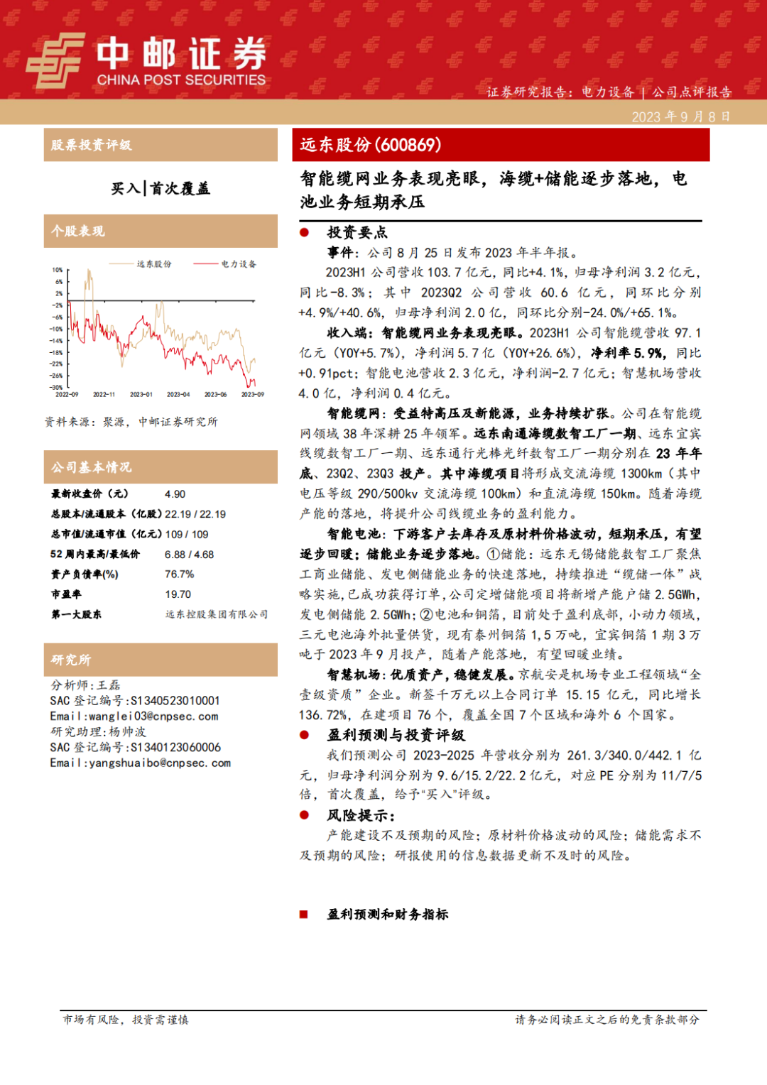 远东股份2023半年报点评:智能缆网业务表现亮眼,海缆+储能逐步落地,电池业务短期承压
