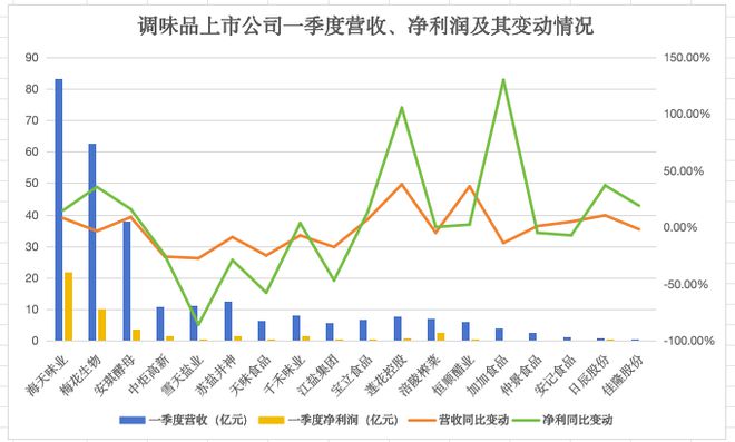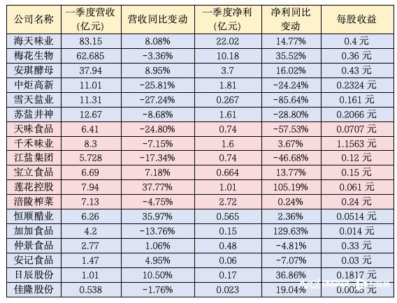 从一季度来看,不少调味品上市公司的业绩有加速下滑趋势,18家上市公司中,五成上市公司一季度的营收处于下滑态势,也有不少企业的净利润同比下跌。