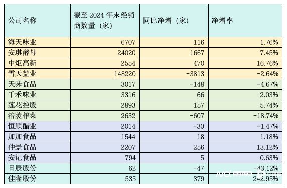 经销商规模变化来看,行业分化显现。2024年多数调味品上市公司经销商规模呈增长态势,其中佳隆股份(002495.SZ)经销商规模增速最快,同比增长242.95%,从156家暴增至535家。