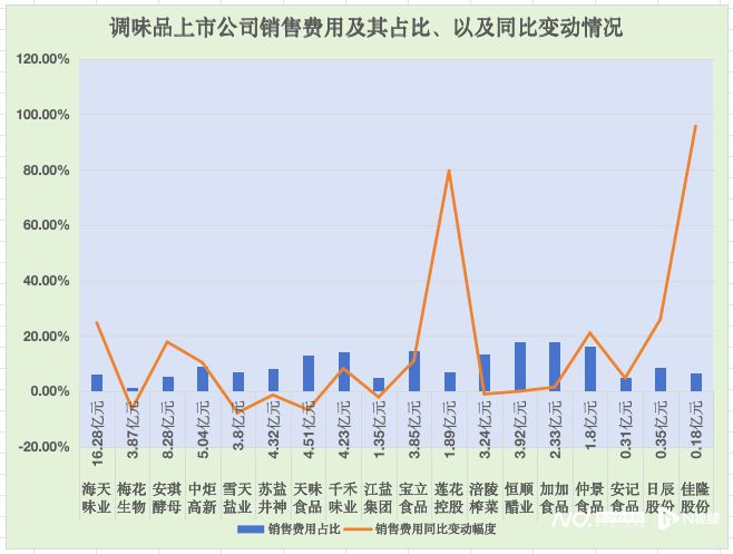 据年报数据,在统计的18家调味品及佐餐上市公司中,11家企业的销售费用呈增长态势。其中,莲花控股(600186.SH)销售费用超1.8亿元,同比暴增79.60%。对于销售费用的激增,莲花控股在年报中解释称因为“销售收入及利润增加,销售人员提成及奖金增加;品牌宣传费用增加”。