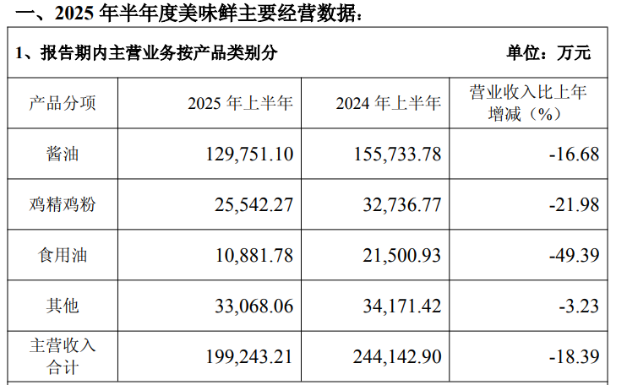 了解到,作为公司的绝对核心,公司调味品板块在上半年承压显著,呈现ldquo;多品类遇冷rdquo;的格局。具体来看,酱油作为调味品板块营收贡献占比超六成的主力品类,上半年实现销售收入12.98亿元,同比下滑16.68%,核心支柱作用呈现弱化;厨邦品牌旗下第二大品类鸡精鸡粉同期收入2.55亿元,同比大幅下降21.98%;食用油产品降幅更是接近腰斩,同比骤降49.39%至1.09亿元;而包含蚝油、食醋、料酒等在内的其他调味品品类,也未能起到ldquo;补位rdquo;作用,上半年收入3.3亿元,同比仍小幅下降3.23%。