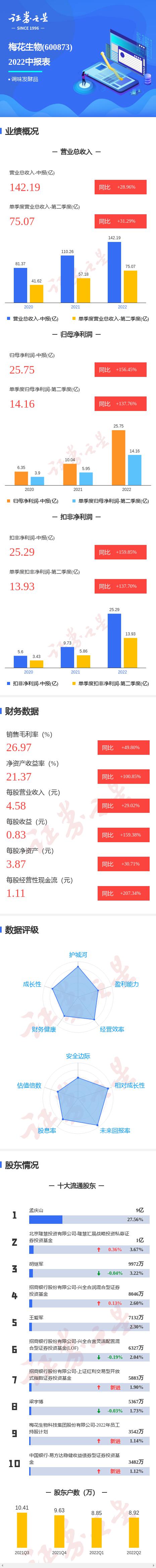梅花生物 2022 中报显示,公司主营收入 142.2 亿元,同比上升 28.96%;归母净利润 25.75 亿元,同比上升 156.45%;扣非净利润 25.3 亿元,同比上升 159.85%;其中 2022 年第二季度,公司单季度主营收入 75.07 亿元,同比上升 31.29%;单季度归母净利润 14.16 亿元,同比上升 137.76%;单季度扣非净利润 13.94 亿元,同比上升 137.7%;负债率 49.41%,投资收益 43.23 万元,财务费用 4475.79 万元,毛利率 26.97%。