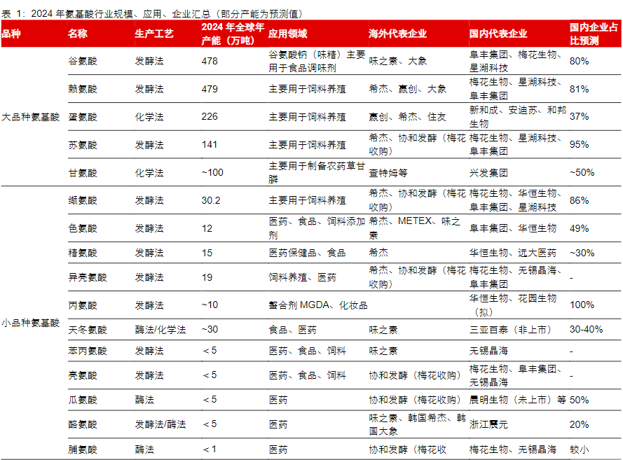 氨基酸有着较为广泛的应用,可用于药品原料、健康食品、化妆品、调味剂、饲料等。氨基酸可以分为大品种氨基酸和小品种氨基酸。大品种氨基酸的主要应用领域集中在食品、饲料添加等方面,国内生产行业通过产能扩张和行业整合,头部企业集中化、规模效应明显。