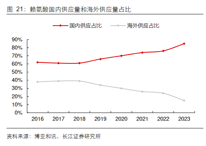 氨基酸主要用于饲料、食品领域,随着亚非拉饲料产量、氨基酸添加比例的增长以及低蛋白日粮的推广,需求有望保持较高增长。同时,海外氨基酸供应占比呈现下滑趋势,国内供应的集中度越来越高。随着集中度提升,相关业务的上市公司盈利有望更上台阶,如梅花生物等。