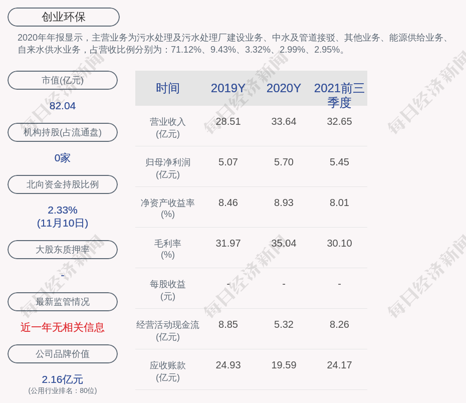 2020年年报显示,创业环保的主营业务为污水处理及污水处理厂建设业务、中水及管道接驳、其他业务、能源供给业务、自来水供水业务,占营收比例分别为:71.12%、9.43%、3.32%、2.99%、2.95%。