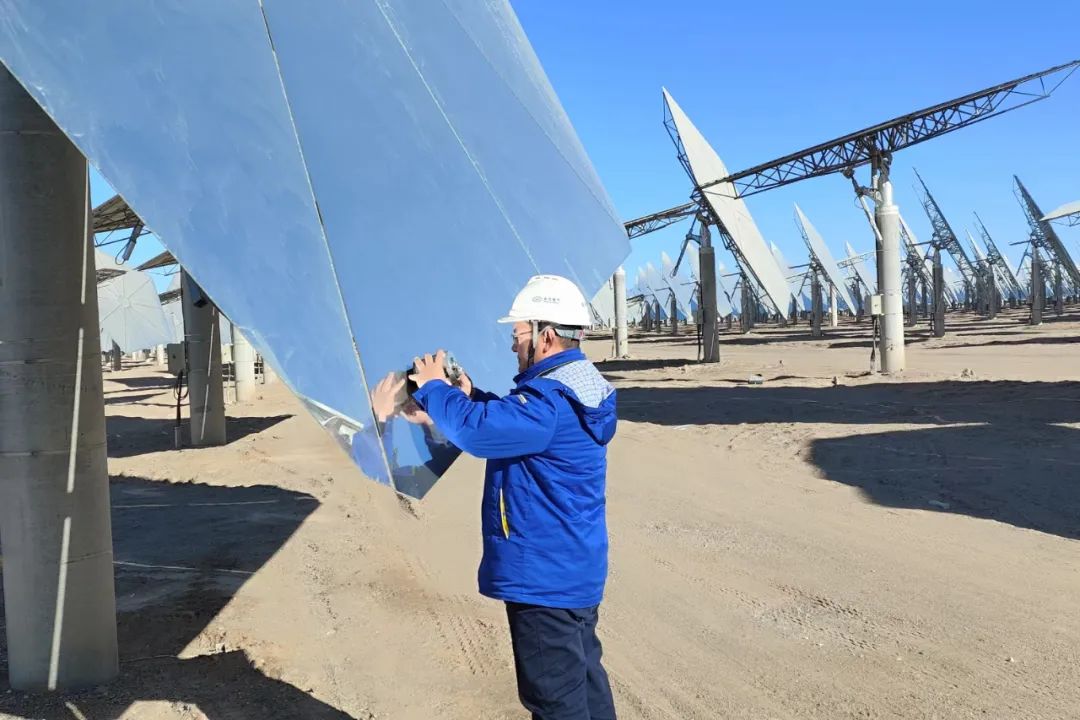 在甘肃阿克塞汇东新能“光热+光伏”项目现场,零下10度的环境下,东方锅炉项目团队成员林雪松在进行定日镜清洁度抽查工作,以确保定日镜聚光反射太阳能的精确性能;东方自控王强开展镜场LOC箱设备调试工作,为聚光集热做准备。