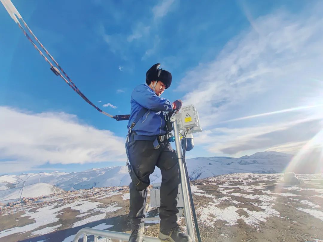 在位于喜马拉雅山北麓的西藏日喀则市萨迦县的萨迦风场,零下6度的环境下,东方风电安调员益西曲培正顶着寒风在塔基安装风机摄像头。