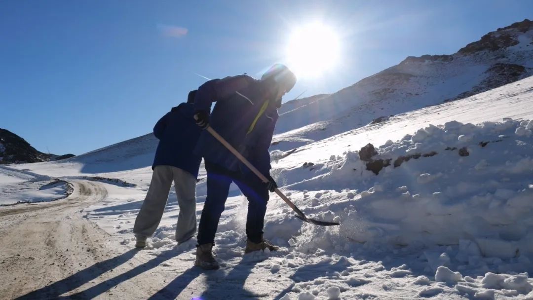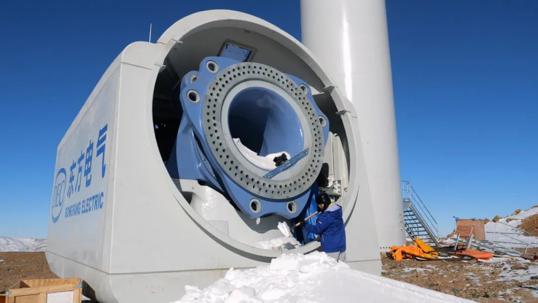 在位于新疆木垒哈萨克自治县东南部的东方电气木垒100万千瓦风电项目现场,零下12度的环境下,东方风电木垒项目团队成员罗宇轩、黄昌毅先后在清理机舱内和路面的积雪,畅通运输道路,为风机吊装做好准备,全力推动项目年内建成投运。