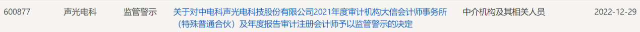 关于对中电科声光电科技股份有限公司2021年度审计机构大信会计师事务所(特殊普通合伙)及年度报告审计注册会计师予以监管警示的决定