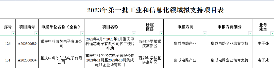 ?重庆中科芯亿达电子有限公司2021年11月至2022年10月集成电路企业培育项目