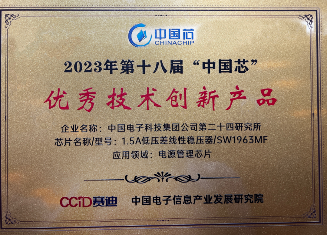 9月20日,以“芯机遇·新未来”为主题的2023年琴珠澳集成电路产业峰会暨第十八届“中国芯”颁奖仪式于珠海举行。电科芯片1.5A低压差线性稳压器从300余款产品中脱颖而出,荣获“中国芯”优秀技术创新产品。