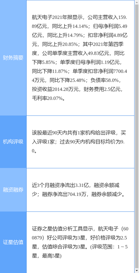 航天电子公布2021年年度报告,2021年公司实现营业收入159.89亿元,同比增长14.14%;归属于上市公司股东的净利润5.49亿元,同比增长14.79%;归属于上市公司股东的扣除非经常性损益的净利润4.89亿元,同比增长20.85%;基本每股收益0.202元。