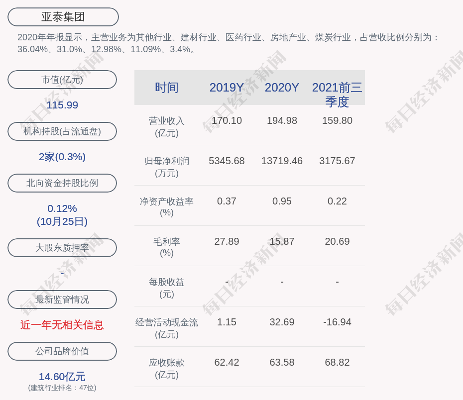2020年年报显示,亚泰集团的主营业务为其他行业、建材行业、医药行业、房地产业、煤炭行业,占营收比例分别为:36.04%、31.0%、12.98%、11.09%、3.4%。