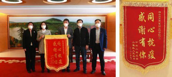 2022年5月18日下午,长春市二道区委常委、统战部部长朱艳专程来到亚泰集团,受区委、区政府委托,向亚泰集团赠送“同心抗疫感谢有你”锦旗。亚泰集团总裁刘树森在亚泰大厦接待朱艳一行,并接受了锦旗。