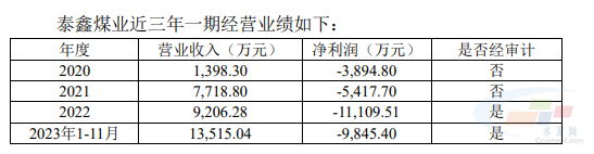 泰鑫煤业2023年1-11月实现营业收入1.35亿元,净利润-9845.4万元。