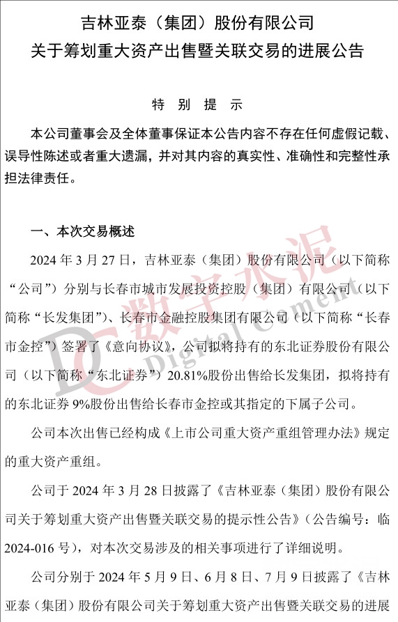 日前,亚泰集团发布《关于筹划重大资产出售暨关联交易的进展公告》称,公司正在筹划将持有的东北证券股份有限公司20.81%的股份出售给长春市城市发展投资控股(集团)有限公司,同时,拟将持有的东北证券的9%股份出售给长春市金融控股集团有限公司或其指定的下属子公司。
