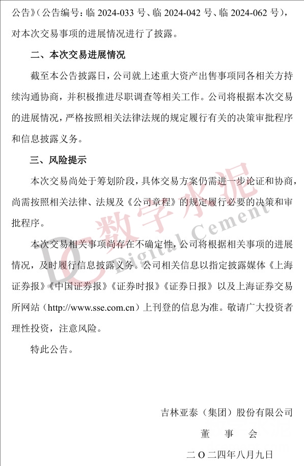截至目前,公司就此次重大资产出售事项同各相关方持续沟通协商,并积极推进尽职调查等相关工作。此次交易方案仍需进一步论证和协商,未来进展将严格按照相关法律法规履行决策审批程序和信息披露义务。