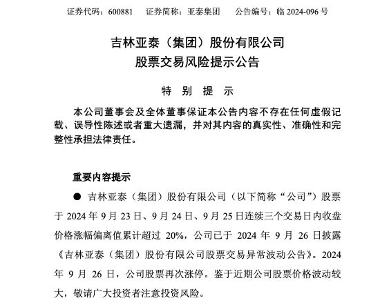 9月26日晚间,亚泰集团(600881)发布股票交易风险提示公告,公司股票于2024年9月23日、9月24日、9月25日连续三个交易日内收盘价格涨幅偏离值累计超过20%,9月26日,公司股票再次涨停。鉴于近期公司股票价格波动较大,敬请广大投资者注意投资风险。
