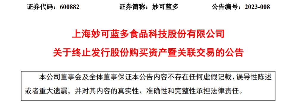 妙可蓝多在公告中表示,自本次交易筹划以来,公司严格按照相关法律法规要求,积极推进各项工作,与交易对方就本次交易事项进行沟通和协商。但由于受到疫情及资本市场波动等各方面客观因素影响,本次交易相关工作筹备时间超出了交易各方预期。经交易各方审慎考虑及沟通协商,决定终止本次交易。