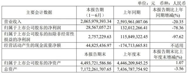 近日,妙可蓝多(600882.SH)发布2023年半年度报告,披露公司上半年实现营业收入20.66亿元,同比减少20.35%;归属于上市公司股东的净利润2856.71万元,同比减少78.36%;基本每股收益0.056元/股。
