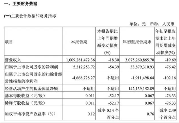 10月27日晚间,妙可蓝多(600882.SH)披露三季度报告,前三季度公司实现营业收入30.75亿元,同比下降19.69%;实现归母净利润3387.93万元,同比下降76.42%。其中,第三季度净利润531.23万元,同比下降54.39%。