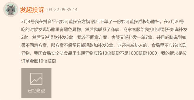 据消费者称:“3月4日我在抖音平台妙可蓝多官方旗舰店下单了一份妙可蓝多成长奶酪杯,在3月20日吃的时候发现奶酪里有黑色异物。”该消费者还表示客服的言语中有威胁人的意图。