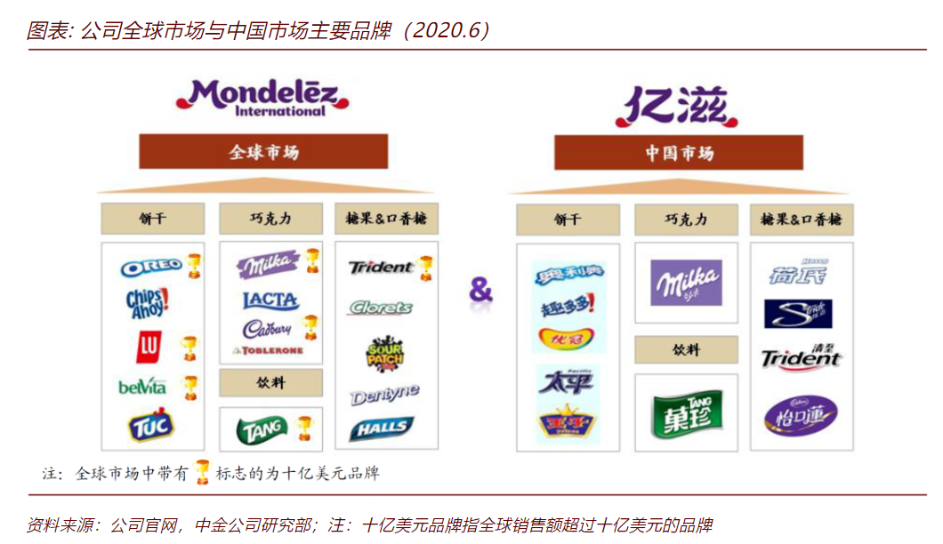 根据中金研究,亿滋国际前身卡夫食品的发展史是一部辉煌的并购史:2001年对纳贝斯克的并购为公司带来了奥利奥、趣多多和乐之等品牌,2007年对达能饼干业务的并购为公司带来了露怡、王子、闲趣、优冠等品牌,而2010年对吉百利的并购为公司带来了怡口莲、荷氏、清至等品牌。对优质企业的并购使得公司不断整合行业资源,扩充产品矩阵,拓宽销售渠道,进入新区域新市场以及快速提升份额,也是公司发展壮大、趋向多元化、成为全球领先企业的重要战略之一。