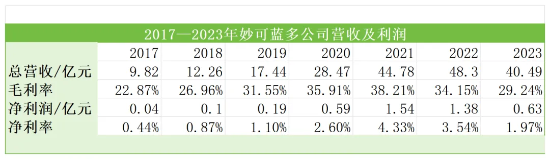 ▲妙可蓝多2017—2023年营收及利润,数据源于财报。镁经小组制图。