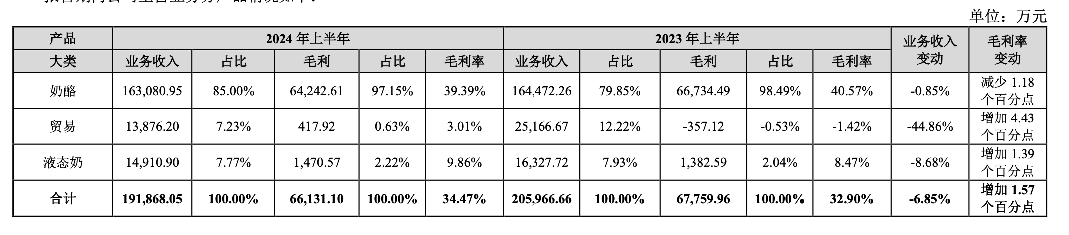 报告期内,妙可蓝多主营业务产品分为奶酪、贸易和液态奶,其中奶酪营收占总营收的85.00%。财报显示,上半年,受外部环境影响,奶酪营收基本持平至16.31亿元;贸易业务营收同比下降44.86%至1.39亿元;液态奶同比下降8.68%至1.49亿元。妙可蓝多在财报中称,在原材料采购成本下降的影响下,贸易业务毛利率显著改善,液态奶的毛利率较上年同期也有所改善。