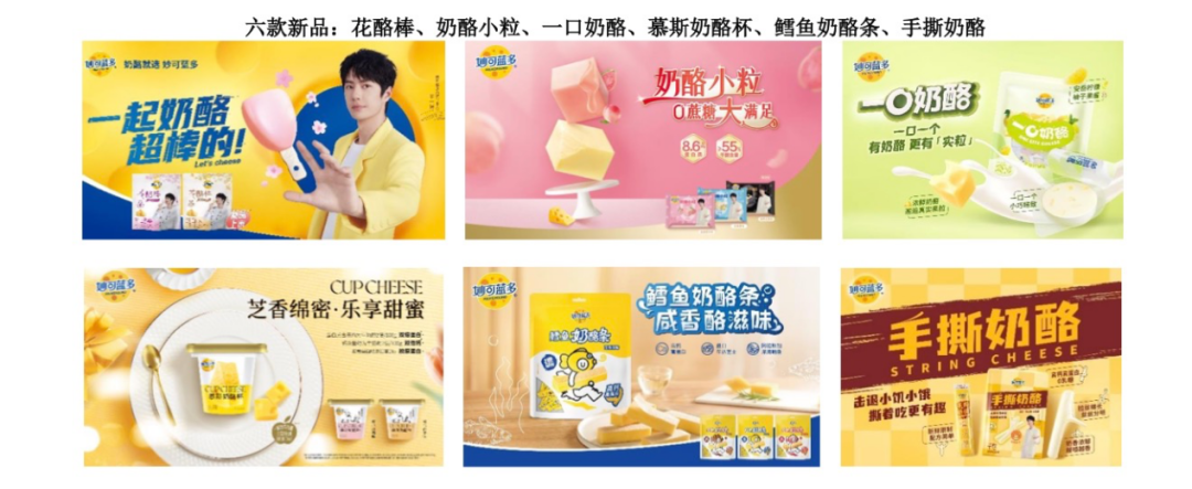 今年以来,妙可蓝多陆续发布了花酪棒、手撕奶酪、鳕鱼奶酪、一口奶酪等面向成人消费群体的奶酪新品。其中,为了贴合年轻人健康化需求,花酪棒主打零蔗糖、低GI、轻负担。同时,妙可蓝多通过媒体投放、利用社交媒体、官方公众号等平台发布品牌故事和产品信息、启用新品牌形象代言人王一博。