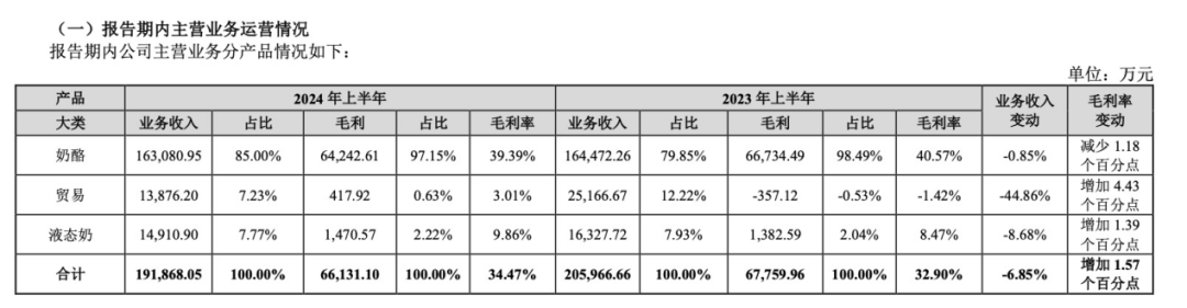 财报显示,2024年上半年,妙可蓝多奶酪营收16.31亿元,同比下滑0.85%;贸易营收1.39亿元,同比下滑44.86%;液态奶营收1.49亿元,同比下滑8.68%。