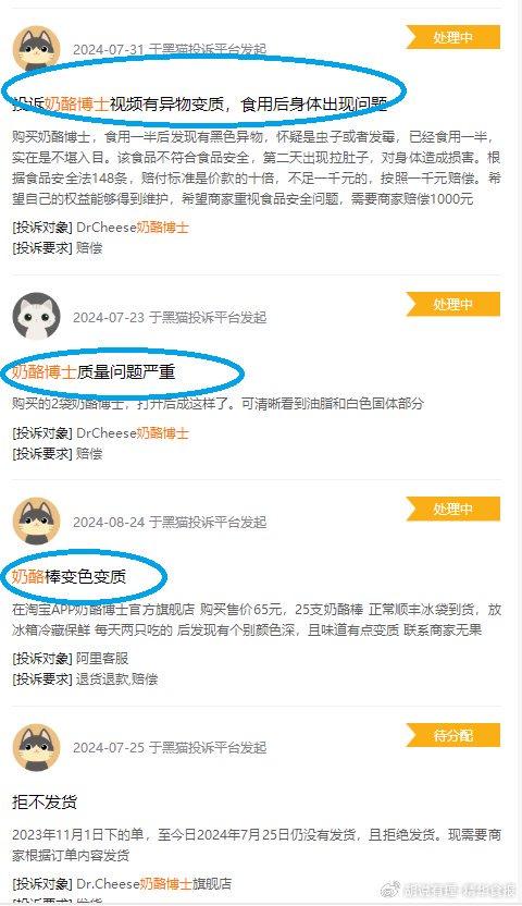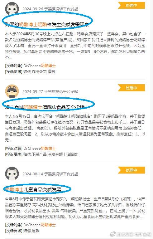 奶酪博士显然也是意识到代工不是长久之计,其最终选择在安徽滁州自建工厂并落成。然而,时至今日,有关奶酪博士食品质量安全问题的投诉依然是接二连三。在黑猫投诉上,近期关于奶酪博士的“变质发黑”“发霉”等投诉屡见不鲜。