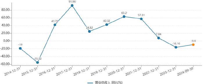 自2016年借壳上市后,妙可蓝多经历了一段高速增长期,2016年至2021年,公司营收增速分别为41.76%、91.96%、24.82%、42.32%、63.2%和57.32%。但从2022年开始,其营收同比增速便大幅下降至个位数;2023年更是遭遇上市以来最大变数,当年实现营业收入40.49亿元,同比下降16.16%,获得净利润6343万元,同比下降53.9%,为上市以来首次出现营收、净利双降。