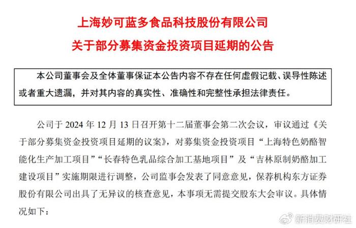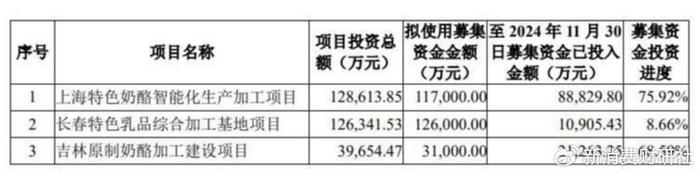 2024年12月,妙可蓝多发布公告称,决定对“上海特色奶酪智能化生产加工项目”“长春特色乳品综合加工基地项目”“吉林原制奶酪加工建设项目”三个募投项目进行延期处理,延期后达到预定可使用状态时间为2026年12月。其中,上海和吉林项目原定于今年12月投入使用,长春项目拟定2025年12月投入使用。