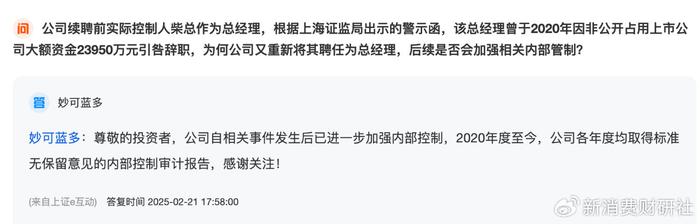 新消费财研社关注到,近期有投资者通过互动平台向妙可蓝多董秘提问:“公司近年屡次因信披违规、财务造假等问题被监管处罚,实控人柴琇女士此前更被曝挪用资金为家族企业纾困,如今管理层是否已整改规范?”这一问询再度引发市场对妙可蓝多公司治理问题的关注。