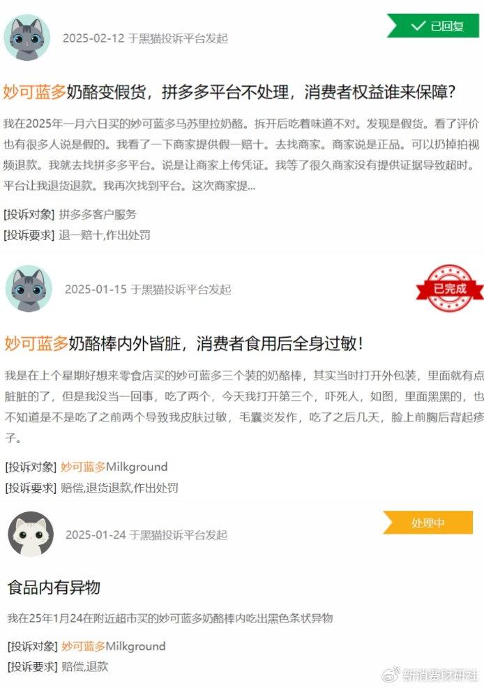 妙可蓝多也在财报中坦言存在食品质量安全事件的风险。黑猫投诉[下载黑猫投诉客户端]平台上,也确实存在多起关于产品异物、变质以及疑似买到假货的消费者投诉信息,其中关于产品“变质”“异物”相关投诉达到数百条,这些均指向妙可蓝多生产环节卫生管控缺失。