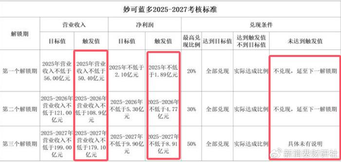 然而,妙可蓝多这份员工持股计划的考核标准却显得相当严格。公司要求2025年的营业收入至少达到56亿元,触发条件为不低于50.40亿元;净利润目标则是不低于2.10亿元,触发条件为不低于1.89亿元。