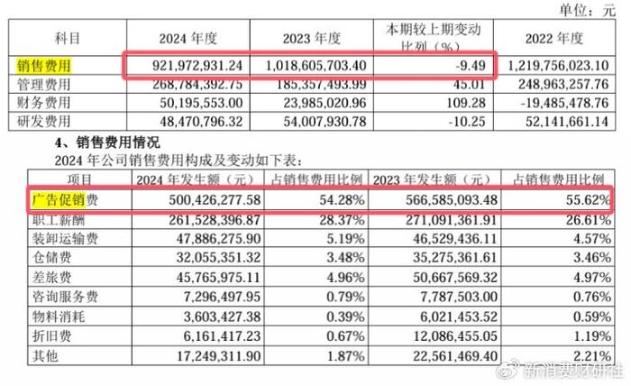 第二是费用收缩策略。2024年公司销售费用同比下降9.49%,减少0.97亿元至9.22亿元,其中广告促销费缩减6600万元;研发费用缩减10.25%,减少0.05亿元,通过“节流”直接推高利润。