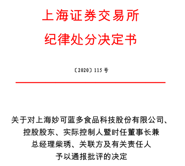 值得注意的是,早在2020年12月,妙可蓝多及柴琇本人曾因资金违规问题受到监管处罚。当时,公司因控股股东关联方违规占用上市公司资金,并导致相关会计处理出现差错,被上海证券交易所出具纪律处分决定书。经查,2019年妙可蓝多曾违规向柴琇家族控制的实体拆借资金达2.395亿元。