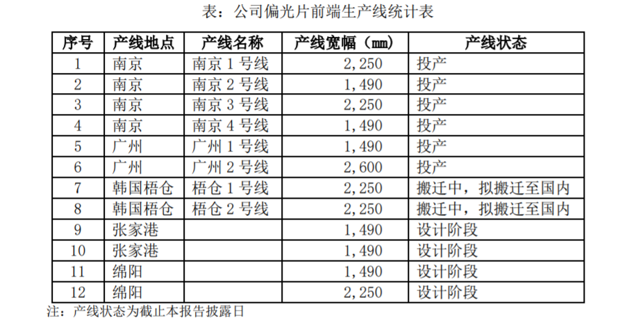 在收购LG化学旗下偏光片业务后,杉杉股份旋即开启了偏光片“国产化”。目前,杉杉股份共拥有八条偏光片前端产线,其中南京四条产线,广州两条产线。而位于韩国梧仓的两条产线正在搬迁中,拟搬迁至国内生产。