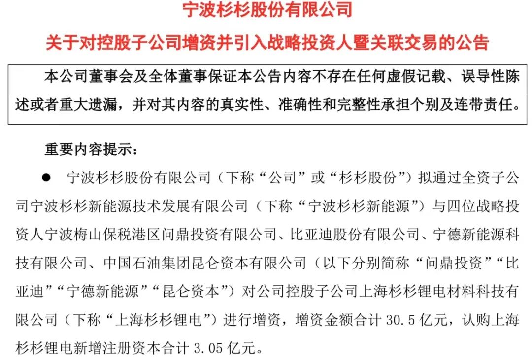 具体来看,宁波杉杉新能源增资24亿元,问鼎投资增资3亿元,比亚迪增资1.5亿元,宁德新能源、昆仑资本分别增资1亿元。值得一提的是,问鼎投资由宁德时代全资控股,昆仑资本则隶属中国石油集团。