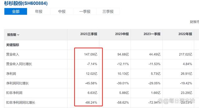 杉杉股份的财报显示,2023年三季度其营收为147.09亿元,同比下降7.14%;净利润12.02亿元,同比近腰斩。而且2022年杉杉股份的净利润就已经出现同比负增长的态势。